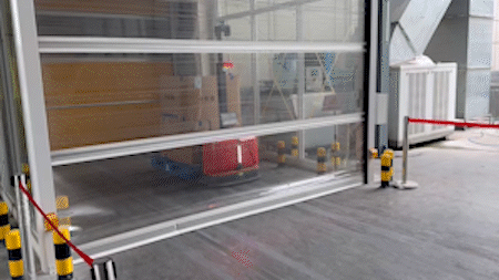 本项目车间与仓库分处两个区域,通过一条连廊连通。车间整托500KG成品下线后,需经自动门与连廊,入库区完成搬运;整托成品出库后,空托盘经堆垛,需转运至车间缓存位备用。
