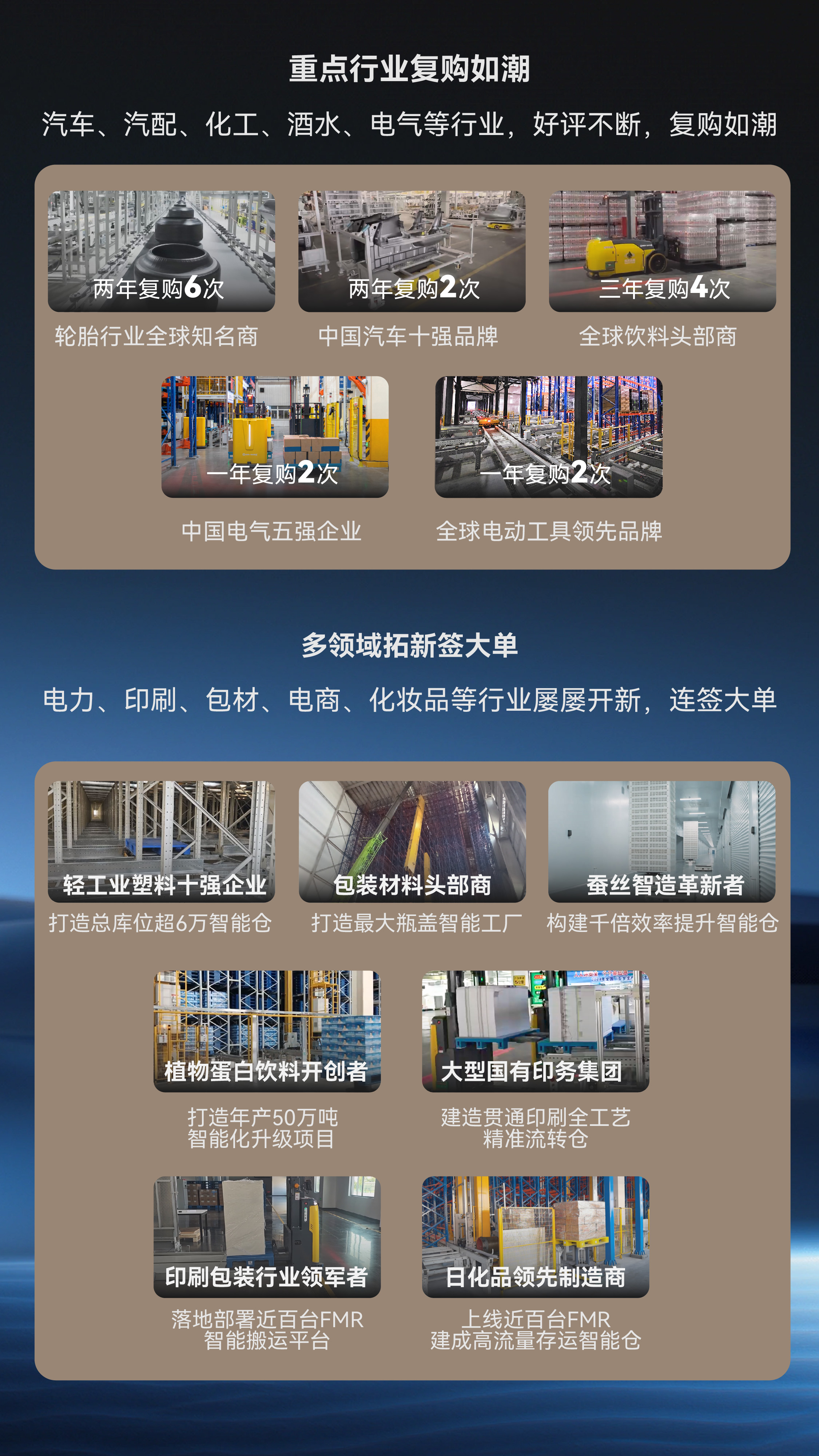 牵手中国轻工业塑料十强企业,打造总库位超6万智能仓;牵手包装材料头部商,打造最大瓶盖智能工厂;联手大型国有印务集团;建造贯通印刷全工艺精准流转仓;牵手印刷包装行业领军者落地部署近百台FMR智能搬运平台;携手蚕丝智造革新者,构建千倍效率提升智能仓;携手植物蛋白饮料开创者,打造年产50万吨智能化升级项目;联合日化品领先制造商,上线近百台FMR建成高流量存运智能仓